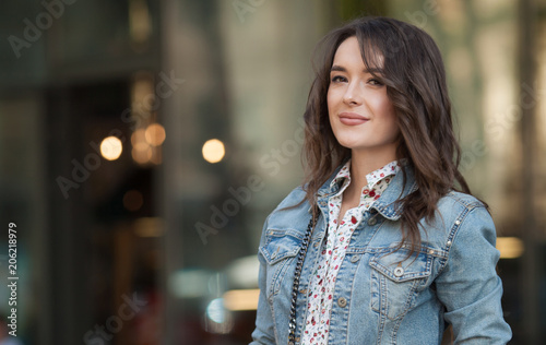 Fototapeta premium Young beautiful stylish girl walking and posing in short summer dress in city. Outdoor summer portrait of young woman