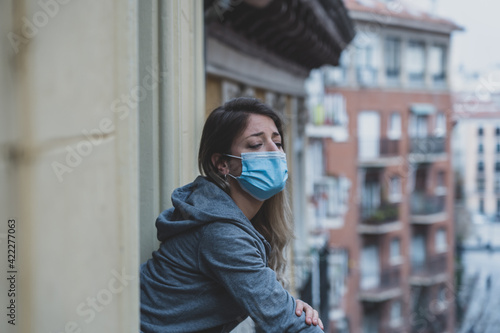 Fototapeta premium Young beautiful unhappy woman with face mask suffering from depression due to isolation