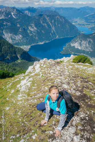 © alexpolo, Naklejka premium Young beautiful woman against valley and lake