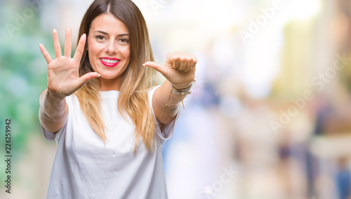 © Krakenimages.com, Fototapeta premium Young beautiful woman casual white t-shirt over isolated background showing and pointing up with fingers number six while smiling confident and happy.