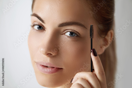 © verona_studio, Obraz premium Young beautiful woman correcting shape of eyebrows. Contouring Eyebrow makeup .