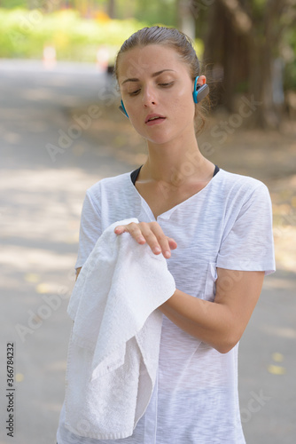© Ranta Images, Naklejka premium Young beautiful woman exercising at the park outdoors
