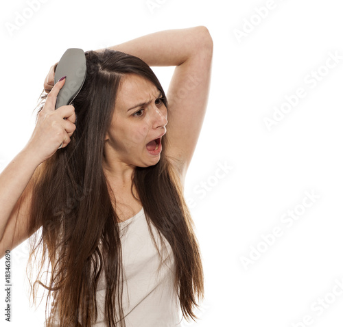 Fototapeta premium young beautiful woman has a problem with the combing her long hair