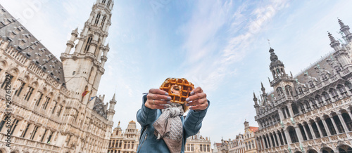 © LALSSTOCK, Fototapeta premium Young beautiful woman holding a traditional Belgian waffle on the background of the Great Market Square in Brussels, Belgium