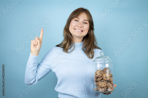 © Irene, Obraz premium Young beautiful woman holding chocolate chips cookies jar over isolated blue background showing and pointing up with fingers number one while smiling confident and happy