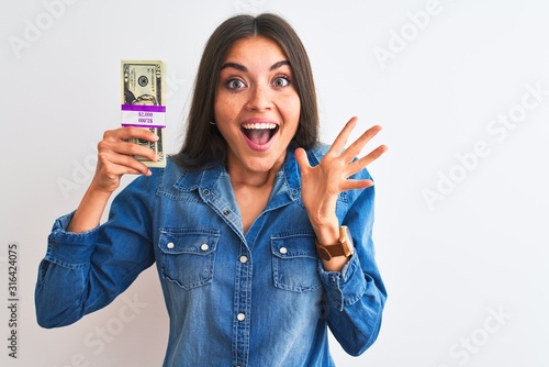 © Krakenimages.com, Obraz premium Young beautiful woman holding dollars standing over isolated white background very happy and excited, winner expression celebrating victory screaming with big smile and raised hands