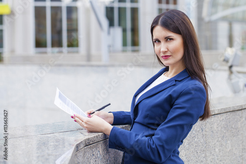 © Andrey_Arkusha, Obraz premium Young beautiful woman in a blue jacket signs the contract