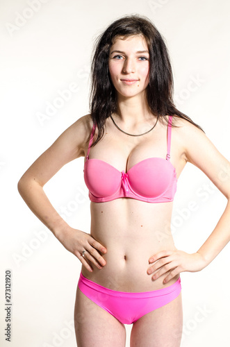© Oleksandr, Fototapeta premium Young beautiful woman in a fashionable linen luxury brunette in the Studio