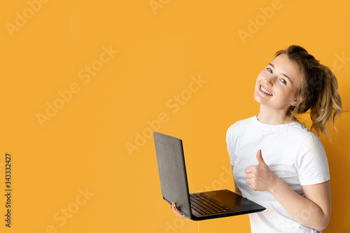 © Andrii Lysenko, Naklejka premium young beautiful woman in a white t-shirt with a laptop in her hands. Emotion of happiness and fun. A smile on his face. The thumb is up.