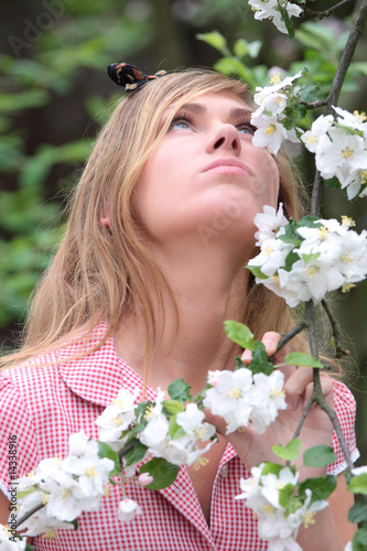 © Piotr Marcinski, Obraz premium Young beautiful woman in red and white dress