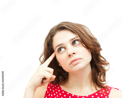 © olezzo, Obraz premium young beautiful woman in red blouse thought, isolated on white b