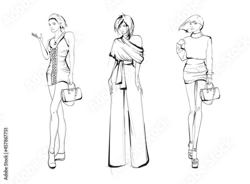 Fototapeta premium Young beautiful woman in stylish clothes. Sale concept. Hand-drawn fashion...