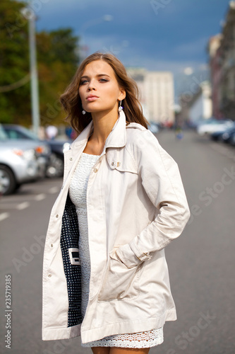 © Andrey_Arkusha, Fototapeta premium Young beautiful woman in white coat