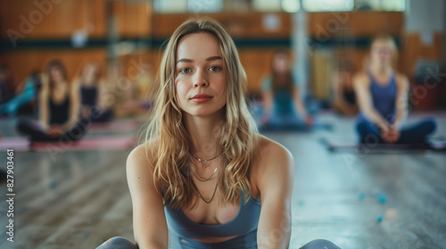 Fototapeta premium Young beautiful woman in yoga class her first day, people meditating in bakground, mental health and mindfulness concept