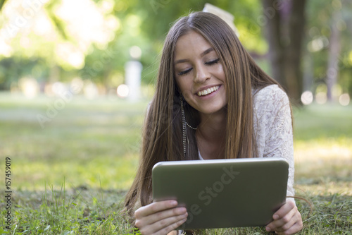 Fototapeta premium Young beautiful woman lying in the grass, looking at the tablet and enjoy nature