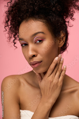 Fototapeta premium Young beautiful woman poses gracefully against a soft pink background, exuding charm and elegance