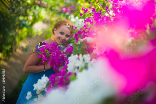 Fototapeta premium Young beautiful woman posing in a flower garden. The girl is dressed in a...