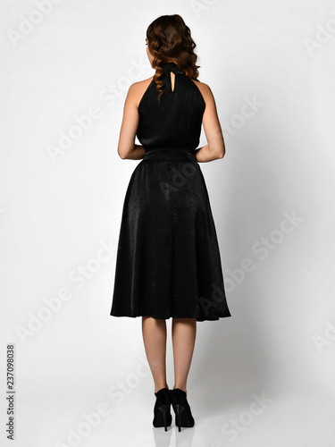 Fototapeta premium Young beautiful woman posing in new dark black fashion winter dress backside rear view