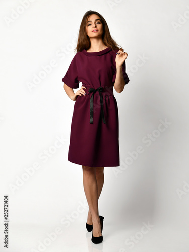Fototapeta premium Young beautiful woman posing in new fashion casual purple winter dress smiling on white