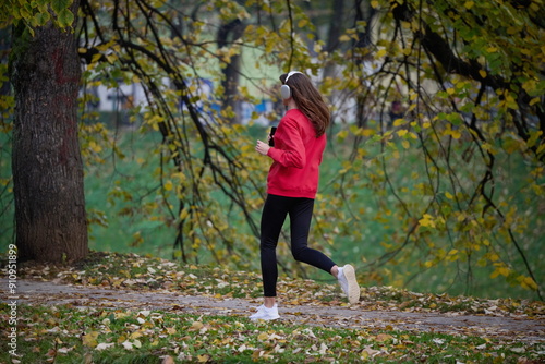 Fototapeta premium Young beautiful woman running in autumn park and listening to music with...