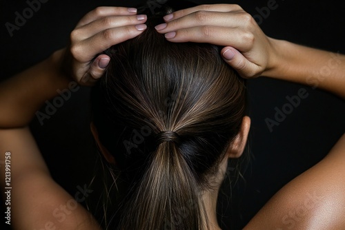 © JAYDESIGNZ, Obraz premium Young beautiful woman touching her hair isolated on black background