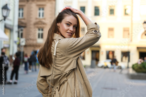 © Petr Smagin, Fototapeta premium young beautiful woman walks in the city and straightens her hair
