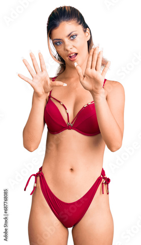 © Krakenimages.com, Fototapeta premium Young beautiful woman wearing bikini doing stop gesture with hands palms, angry and frustration expression
