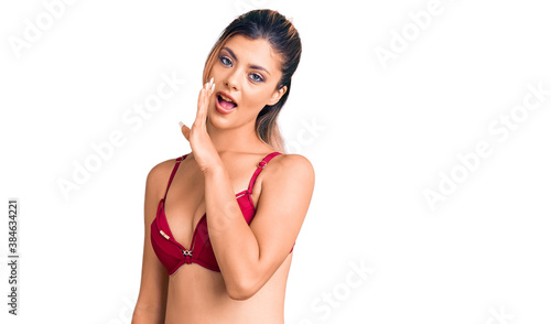 Fototapeta premium Young beautiful woman wearing bikini hand on mouth telling secret rumor,...