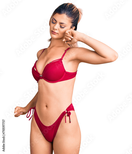 Fototapeta premium Young beautiful woman wearing bikini stretching back, tired and relaxed,...