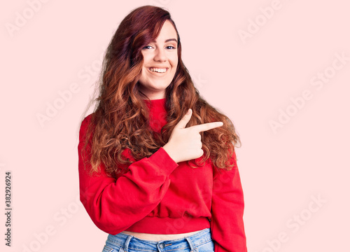 Fototapeta premium Young beautiful woman wearing casual winter sweater cheerful with a smile of face pointing with hand and finger up to the side with happy and natural expression on face