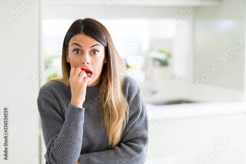 © Krakenimages.com, Naklejka premium Young beautiful woman wearing winter sweater at home looking stressed and nervous with hands on mouth biting nails. Anxiety problem.