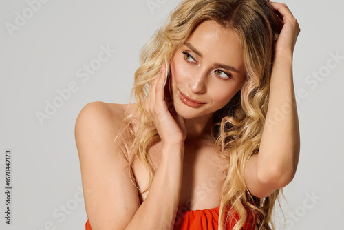 © Bliss, Obraz premium Young beautiful woman with blonde hair showcasing fashion style in a bright setting