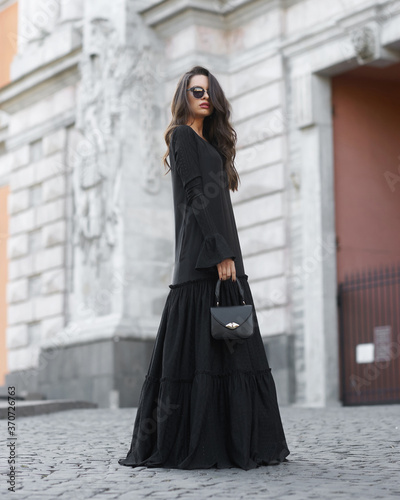 © Dmitry Tsvetkov, Fototapeta premium Young beautiful woman with brunette hair wearing long black dress and sunglasses, holding leather handbag and walking at city street on a summer day. Outdoor full length fashion portrait. Female model