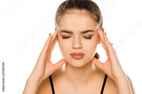 © vladimirfloyd, Naklejka premium Young beautiful woman with headache posing on white background