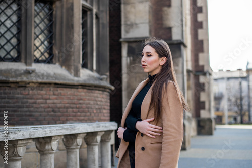 Fototapeta premium Young beautiful woman with long brown hair in sunglasses on a walk on a cloudy day. Fashionable sexy girl. Street fashion look. Cute student.