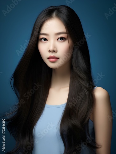 © Ahmad , Fototapeta premium Young beauty japanese woman long straight hair with Korean style makeup and perfect clean skin on isolated blue background, AI Generative