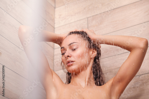 Fototapeta premium Young beautyful woman under shower in bathroom.