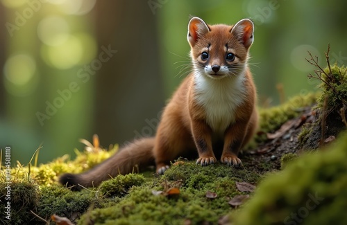 © Vadym, Obraz premium Young beech marten sits on mossy ground in green forest. Small animal with white chest fur looks at camera. Cute wild carnivore mammal in its natural habitat, outdoor.