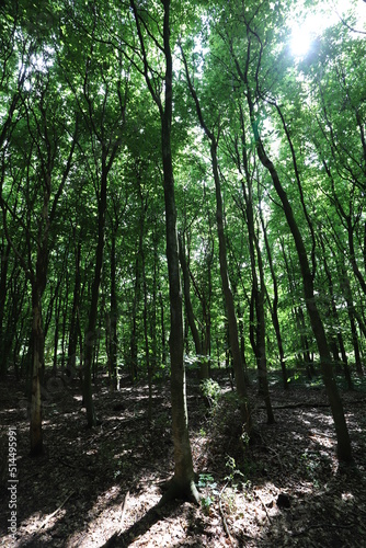 Obraz premium Young beech trees in the beginning of the summer, sun in forest background.