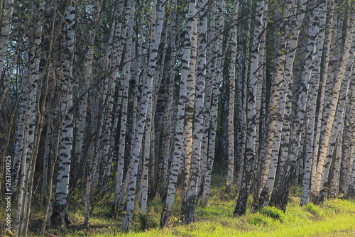 Fototapeta premium young birch forest in the rays of the rising sun in mid-spring