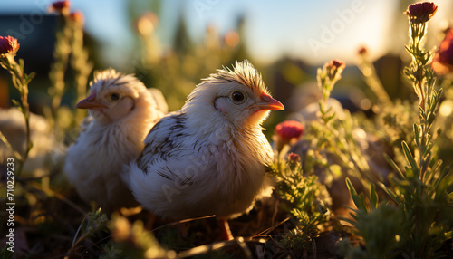 Fototapeta premium Young bird standing in green meadow, looking cute generated by AI