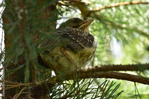 © yarvin13, Fototapeta premium Young bird thrush in sunlight on a tree in pine branches