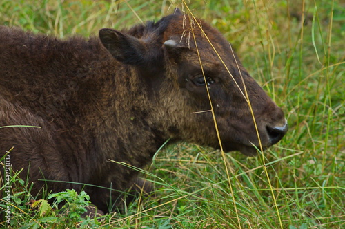 © Олег Раков, Fototapeta premium Young bison in the open-air cage of the nursery.