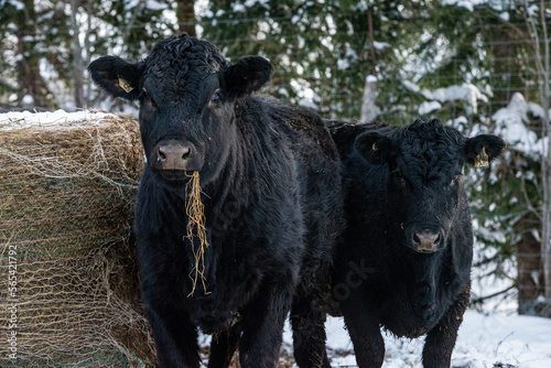 © Beatrice, Fototapeta premium Young black angus heifer eating hay in winter pasture