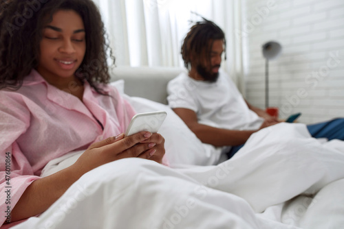 © Svitlana, Fototapeta premium Young black couple watching on smartphones in bed