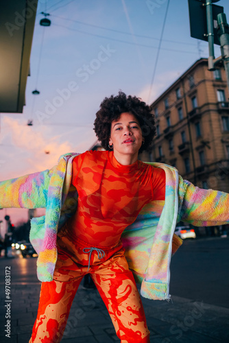 © Eugenio Marongiu, Fototapeta premium Young black curly hair dancer fashionable stylish performer dancing outdoor