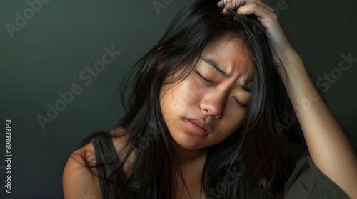 © Francheska, Obraz premium Young black-haired woman, tired and very sleepy expression. generative ai