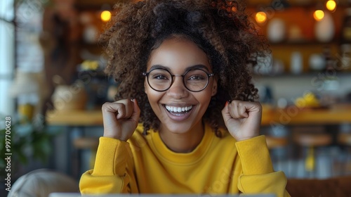 © Алина Бузунова, Fototapeta premium young black joyful woman sitting at home and celebrating online shopping win with positive emotions