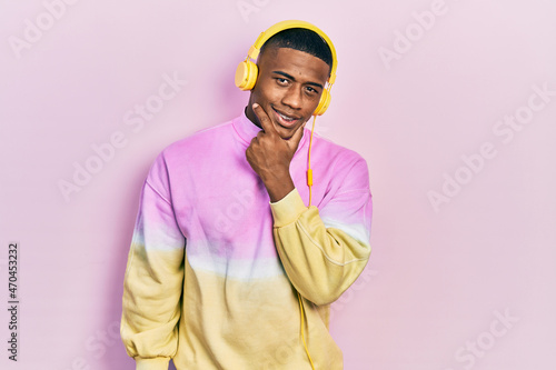 Fototapeta premium Young black man listening to music wearing headphones looking confident at the camera smiling with crossed arms and hand raised on chin. thinking positive.
