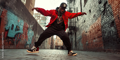 Fototapeta premium Young Black man practicing dance moves in empty alleyway, wearing hip hop...